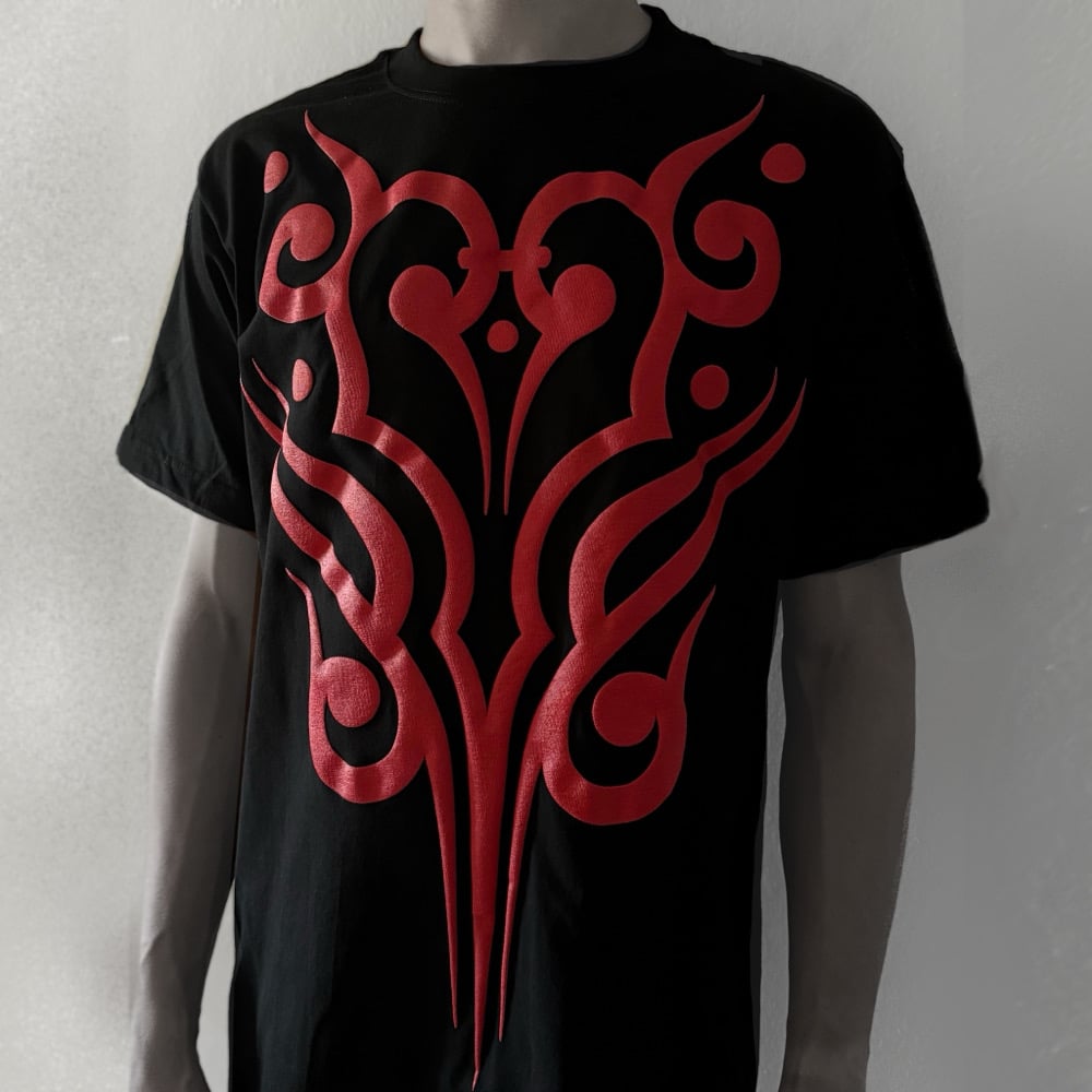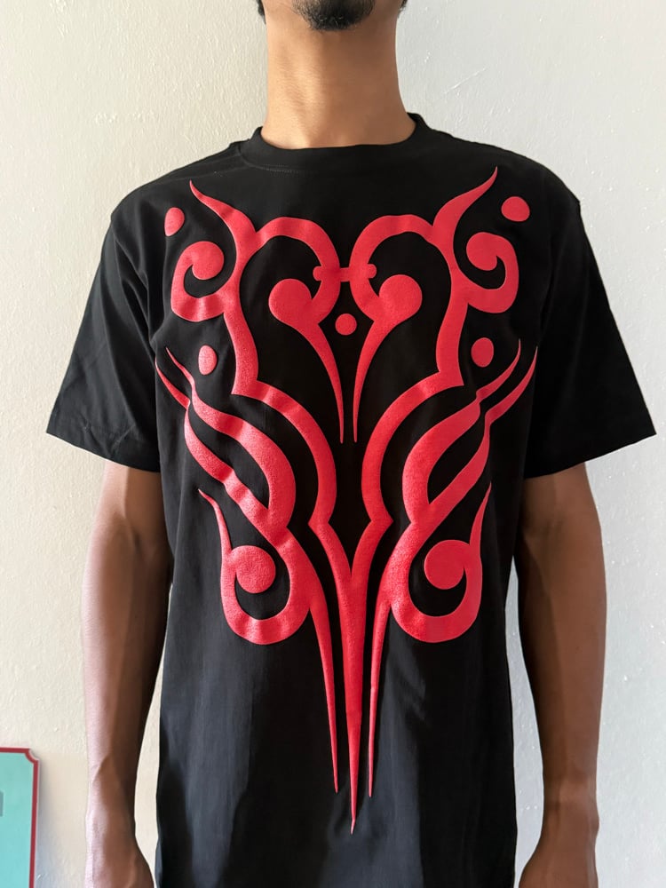 Black heavy weight 100% cotton T-shirt with screen printed puff fabric ink red ornamental design.